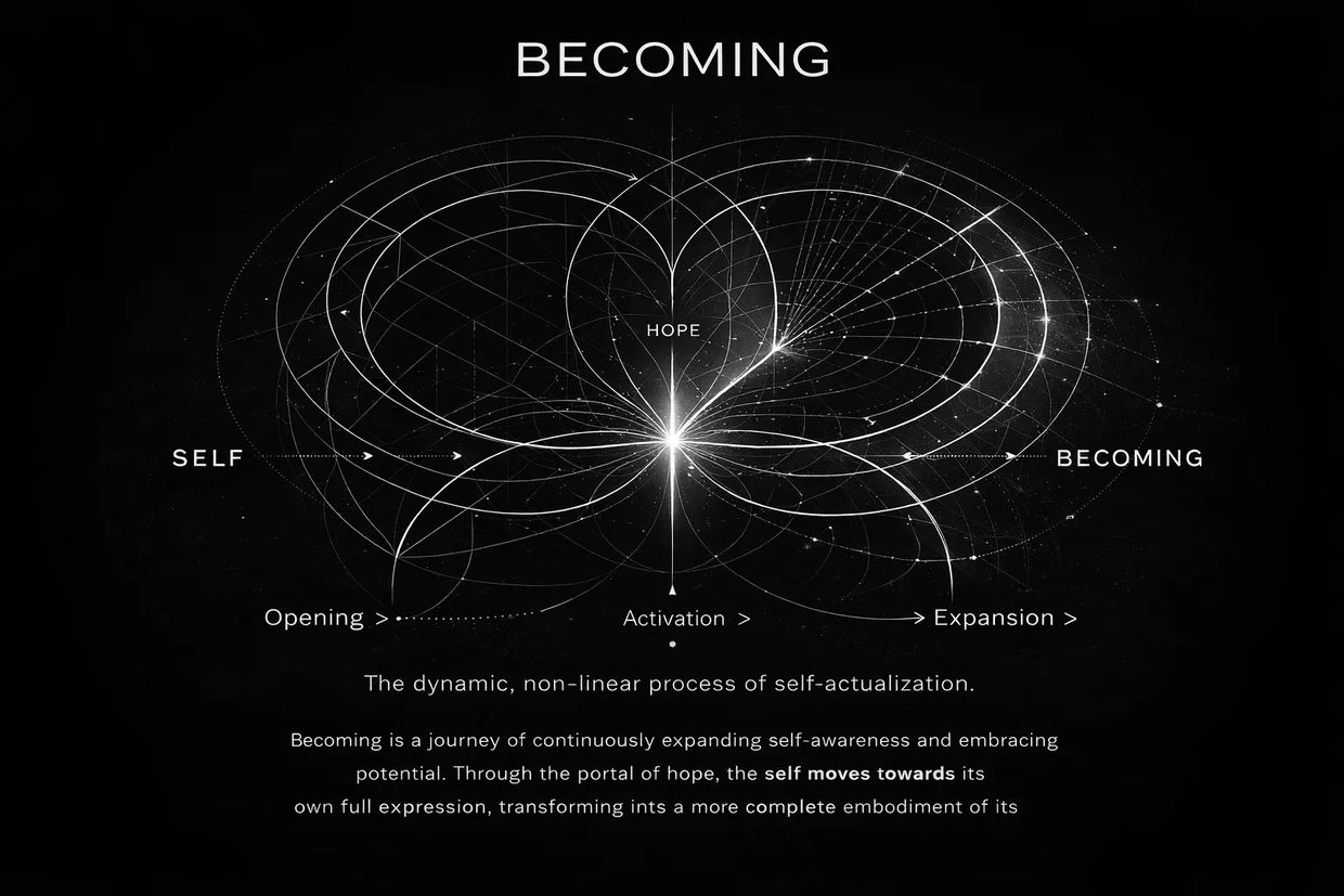 In Hope²Change™, becoming is understood not as a linear path or fixed outcome, but as a living movement within the Field of Becoming—where structure, intention, and agency interact continuously.